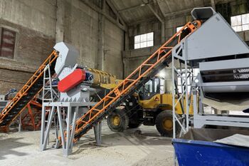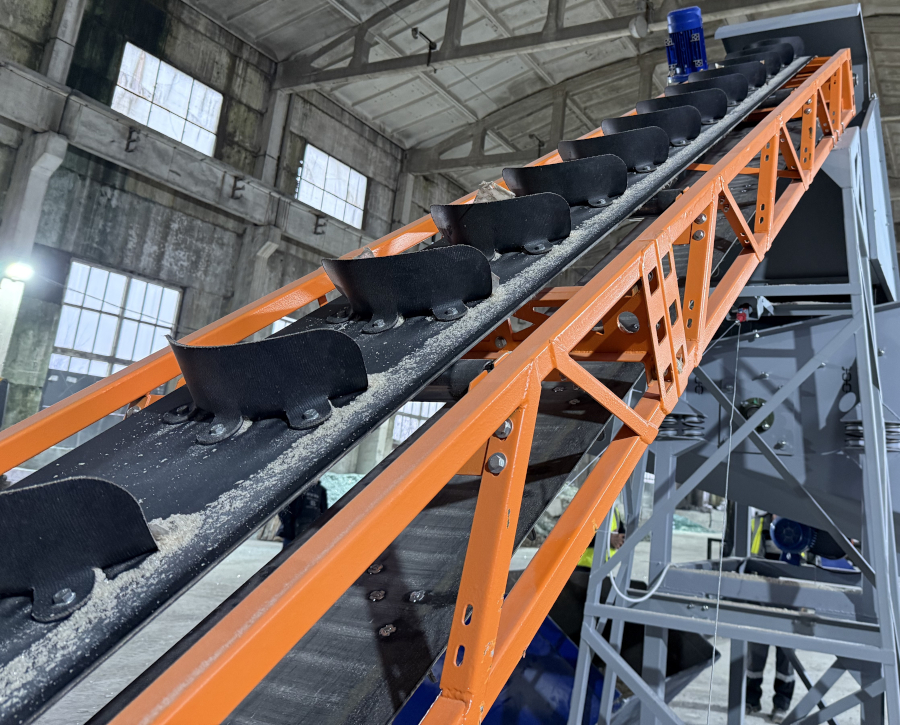 Увеличение угла подачи вышеперечисленных материалов, обеспечивается за счет использования эластичных перегородок С-образной формы, высотой 100 миллиметров, закрепленных на транспортерной ленте посредством болтовых соединений.