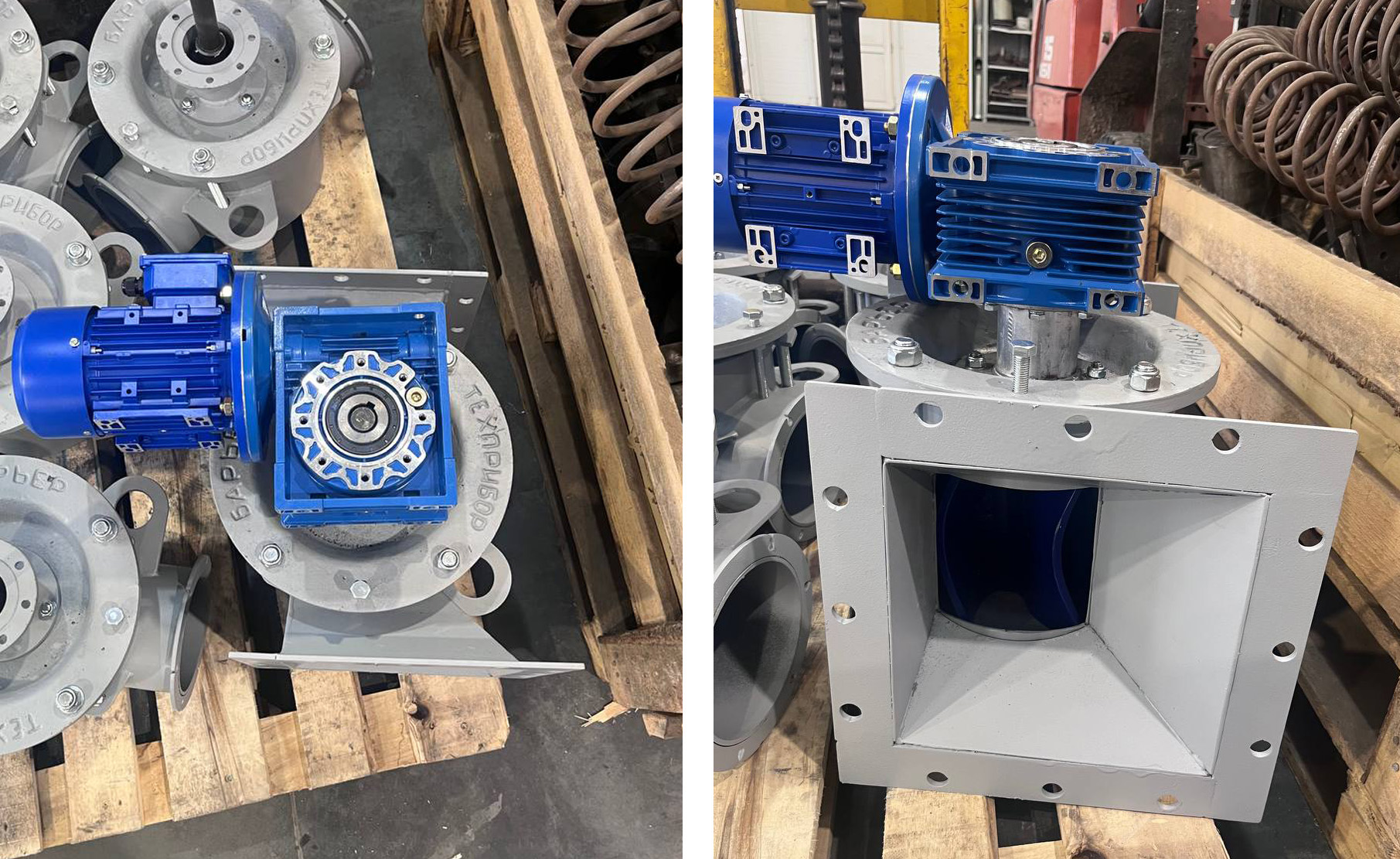Оборудование выполнено по индивидуальному техническому заданию Заказчика — со смещенными патрубками. Такое конструктивное решение позволит без проблем вмонтировать затвор в уже существующую производственную линию, исключив необходимость её перестройки.