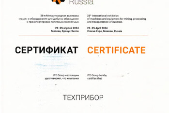 За активное участие в 28-й Международной выставке машин и оборудования для добычи, обогащения и транспортировки полезных ископаемых «MiningWorld Russia» завод «ТЕХПРИБОР» награждён сертификатом.